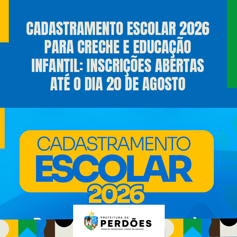 A Prefeitura Municipal de Perdões, por meio da Secretaria Municipal de Educação, informa que está aberto o Cadastramento Escolar para o ano letivo de 2026, destinado às crianças nas faixas etárias correspondentes à Creche (2 e 3 anos) e à Educação Infantil (4 e 5 anos).