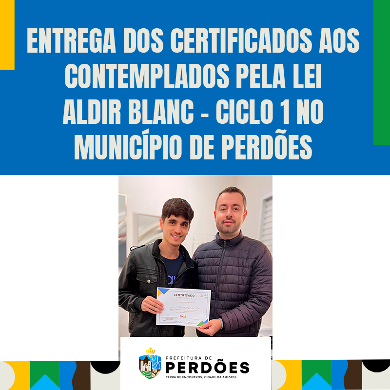 A Prefeitura de Perdões, por meio da Secretaria Municipal de Cultura, realizou a entrega oficial dos certificados aos contemplados pela Lei Aldir Blanc - Ciclo 1, uma importante política pública de fomento à cultura, criada com o objetivo de apoiar trabalhadores e trabalhadoras da cultura durante o período de pandemia.