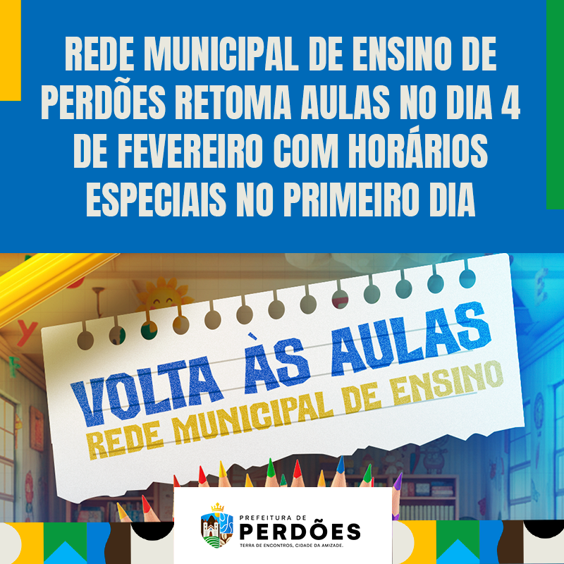 A Prefeitura de Perdões, por meio da Secretaria Municipal de Educação, informa que o retorno das aulas na rede municipal de ensino está marcado para o dia 04 de fevereiro.
